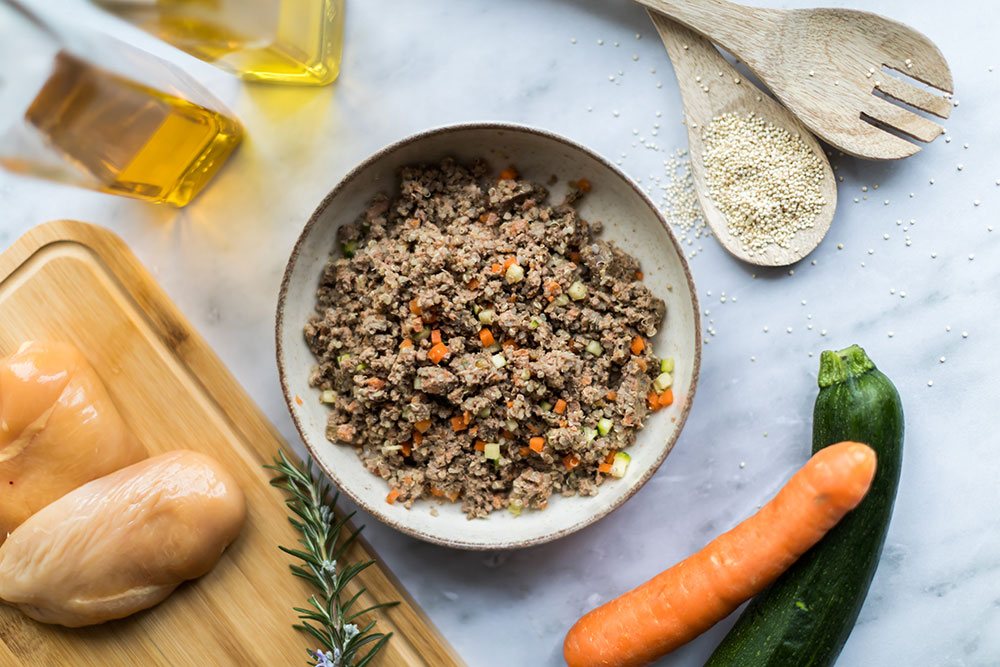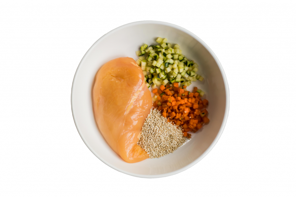 Notre recette au poulet, c’est 60 % de bon poulet français que l’ont a fait mijoter avec des carottes, des courgettes, du quinoa ainsi qu’un peu d’huile de colza et d’huile de tournesol. En bref, un délicieux repas riche en protéines, fibres, vitamines et minéraux qui saura ravir tous les gourmets (même les plus exigeants).